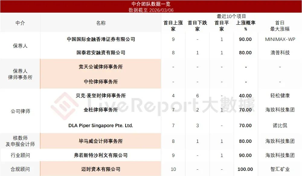 据LiveReport大数据统计,琻捷电子中介团队共计10家,其中保荐人2家,近10家保荐项目数据表现值得肯定;公司律师共计3家,综合项目数据表现中规中矩。整体而言中介团队历史数据表现尚可。